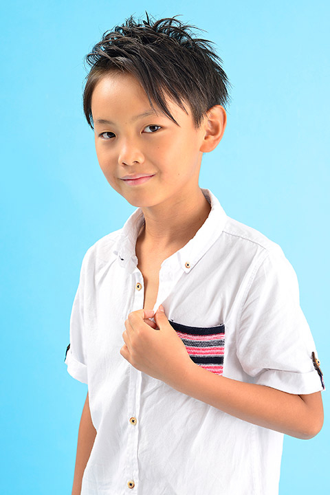 バング(前髪)を立ち上げて男らしさを表現し、ハードワックスでセットして流すスタイル。少しワイルドなキッズファッションにも合うスタイルです。スタイリングポイント