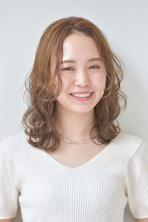 毛先は外ハネでゆるい波ウェーブを全体に作った後に表面を細かくとって巻き、スタイリング剤はヘアオイルをつかって抜け感を出しました。